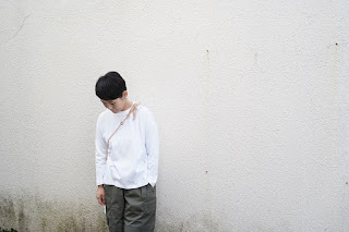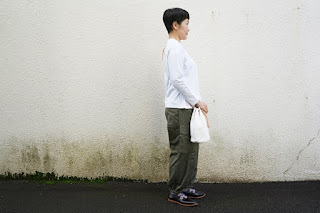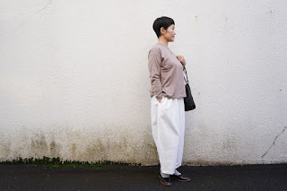 オリーブグリーンのワイドパンツに合わせて、ライトグレージュ。