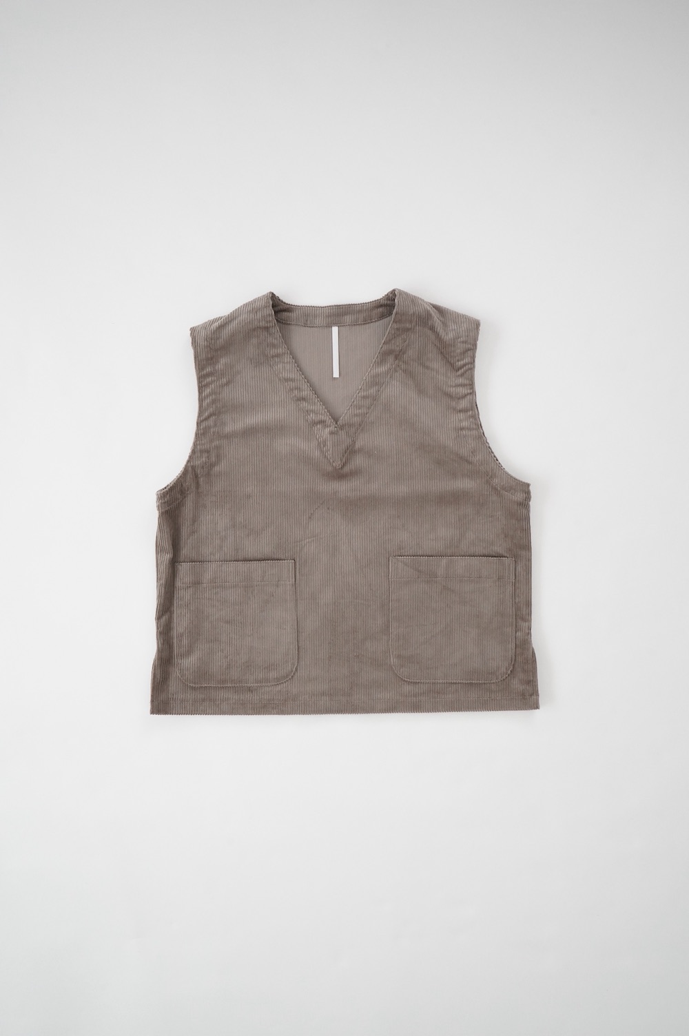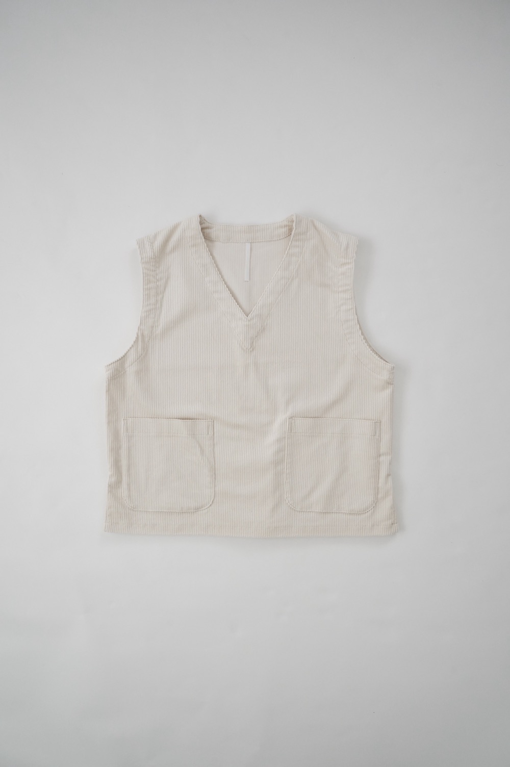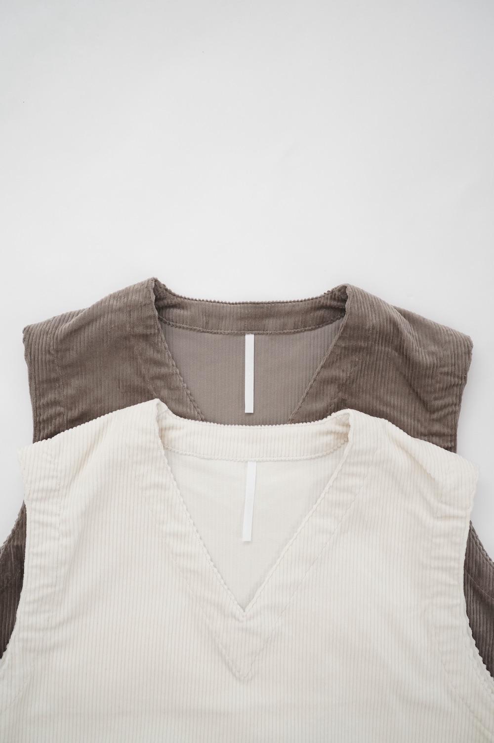 春はリネン素材でも好評でしたVネックベスト。秋冬らしいコーデュロイ素材が入荷しました。