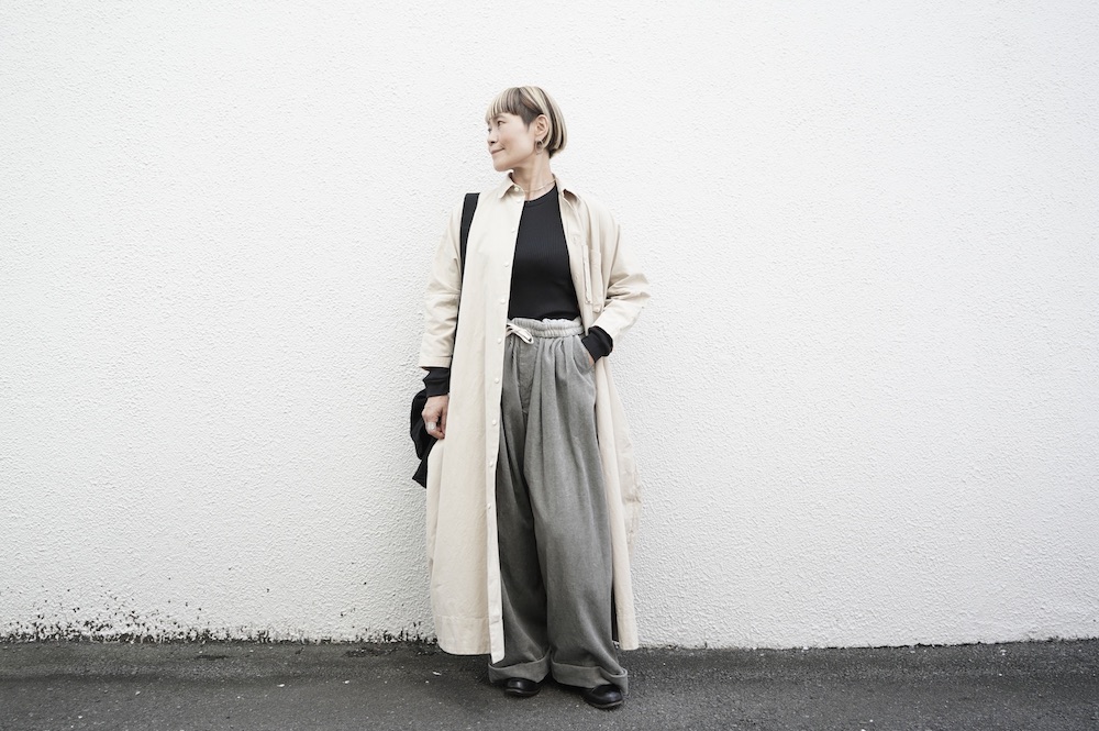 2タックイージーパンツも長く人気のデザイン。ベストと合わせてセットアップも素敵です。