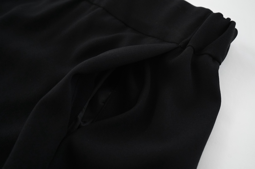 こちらも素材は同じく本格的なフォーマル素材ですが、何と言ってもパッと見でわかるフロントのタックがクールです。だいぶ前側にはなりますが、このタックの内側にポケットもございます。