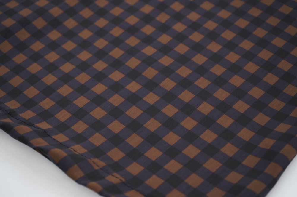 生地は近くで見るとこのようなチェック。ブラウンとネイビーのブロックチェックです。ちょっと黒っぽく見える部分は縦横のネイビーの糸が重なって濃いネイビーになっている部分。