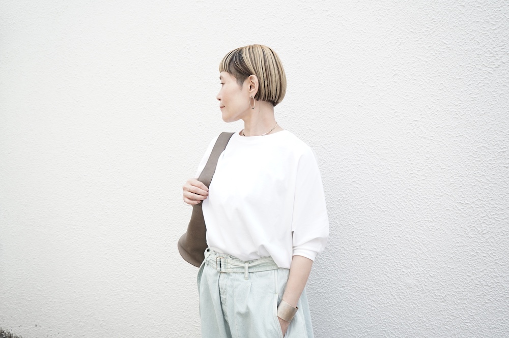 このカットソーみたいに、着ただけで格好がつくTシャツは、夏のワンツーコーデで使いやすく、つい着てしまう洋服になるので、ブランド違いや素材、デザイン違いで何パターンか持っていると良いですよ。ブラウスと違って、ちょっとした外出にもパッと着て行けておしゃれなのが嬉しいアイテムです。引き出し開けて、こういうTシャツが5枚くらい並んでいたら、頼もしい。