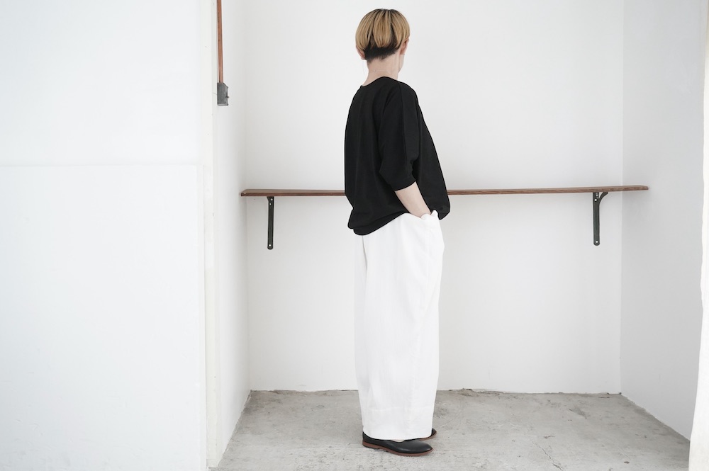 けっこうゆったりした分量感のあるカットソーですが、腰回りで自然に収まることもあり、ボトムは意外になんでも来いな感じです。ワイドパンツやアナベルにはないけど細身にも似合う。スカートにも。そしてタックインもできる。