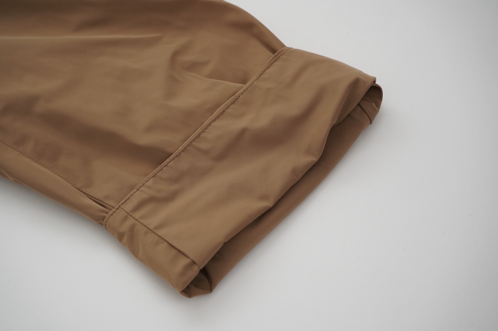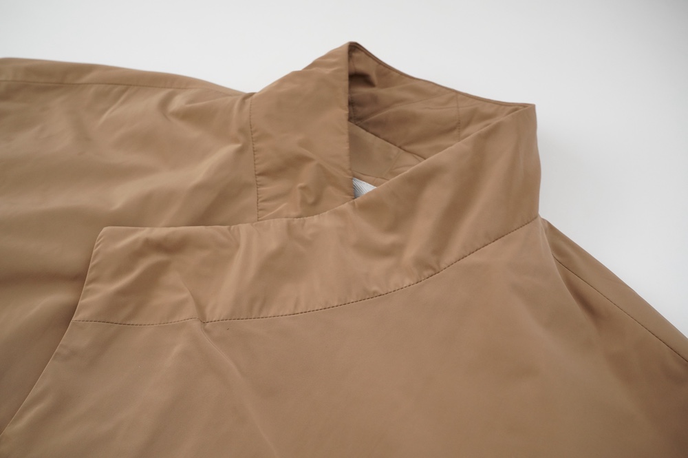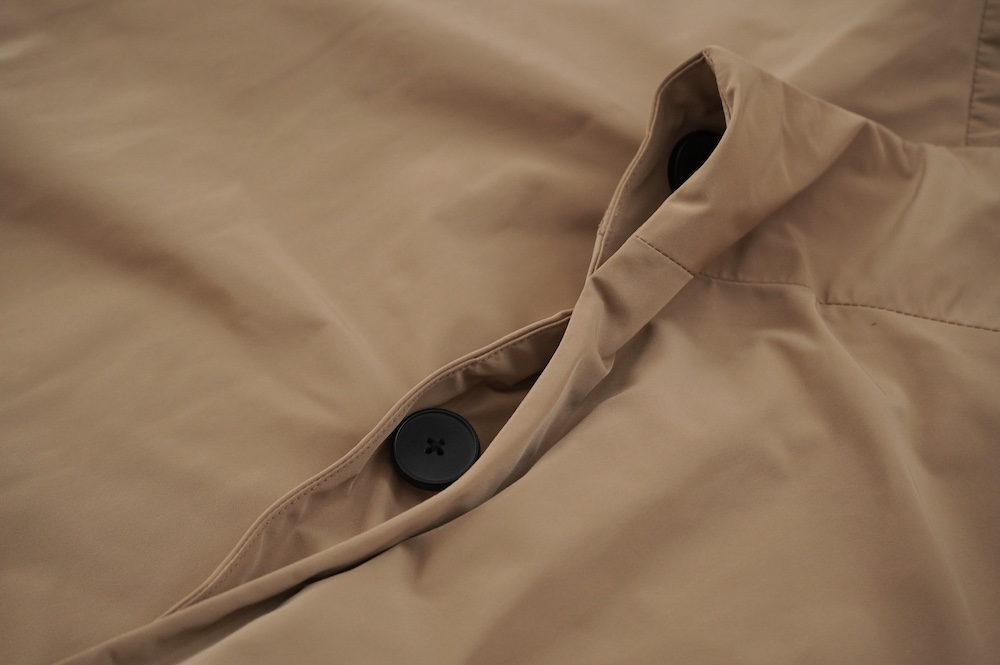 形状記憶なので、高密度だけどシャカシャカ音はいっさいなく、小さくまるめても天然素材のようなシワはまったく付かない。旅行の時などにもお勧めしたい軽いコートです。