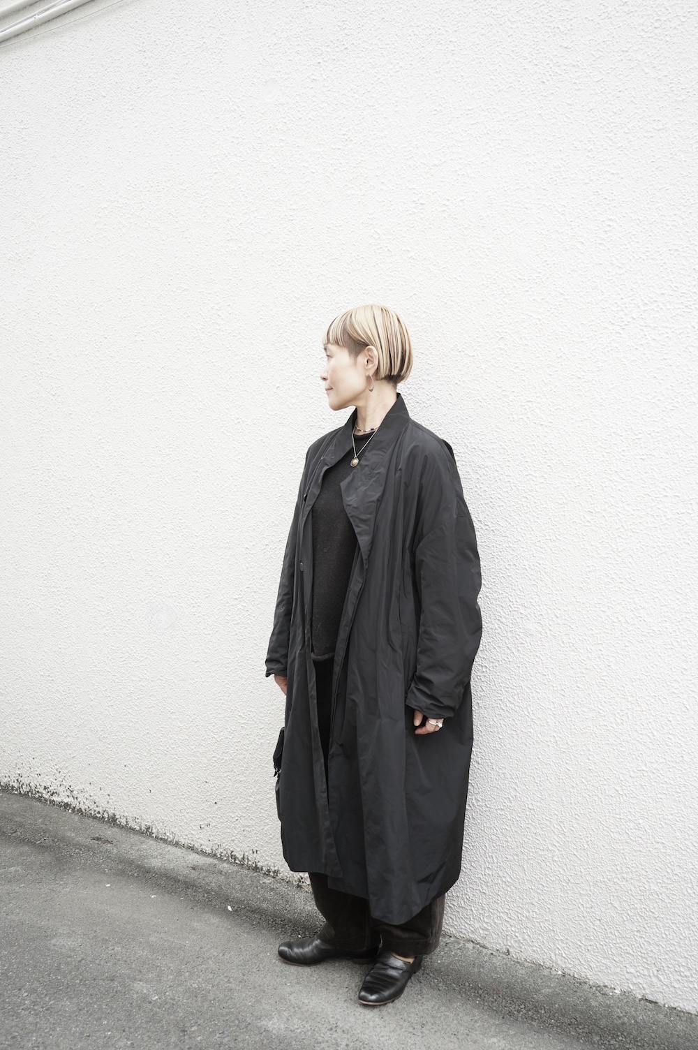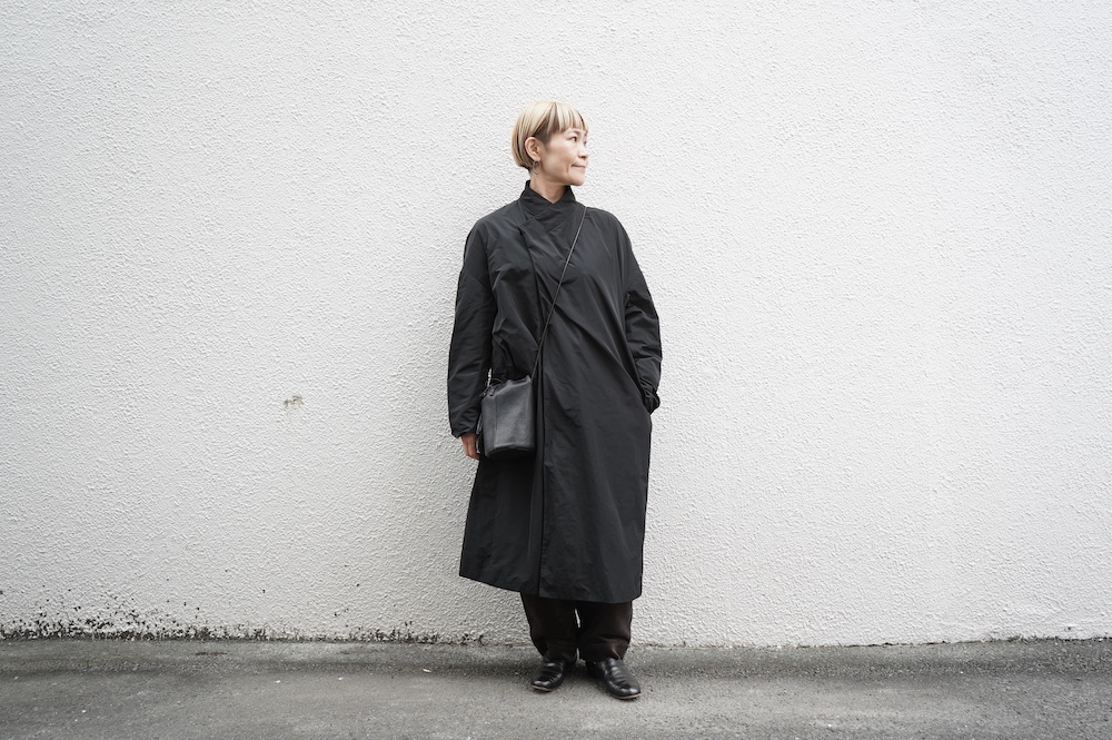 こちらがブラック。さてどちらも捨てがたい色ですね。コートが主張して、コートを着たらそれだけでかっこいい!というコートも持っていたいけど、他の洋服を引き立てながら幅広いスタイリングに寄り添ってくれるコートも必要です。今回はパンツスタイルだけですが、ワンピースやスカートにも。