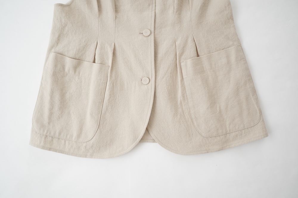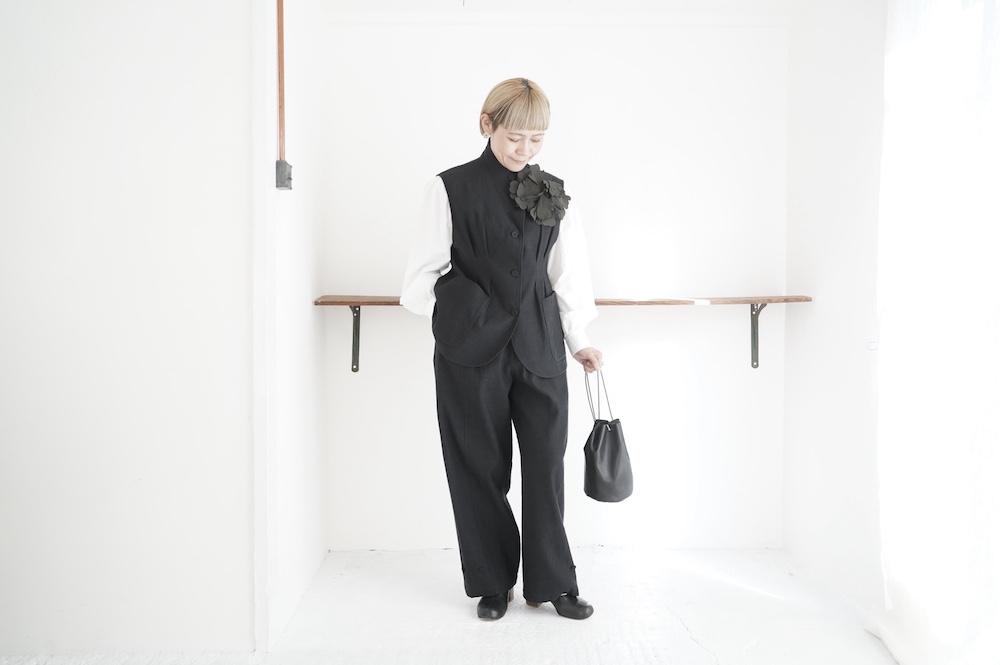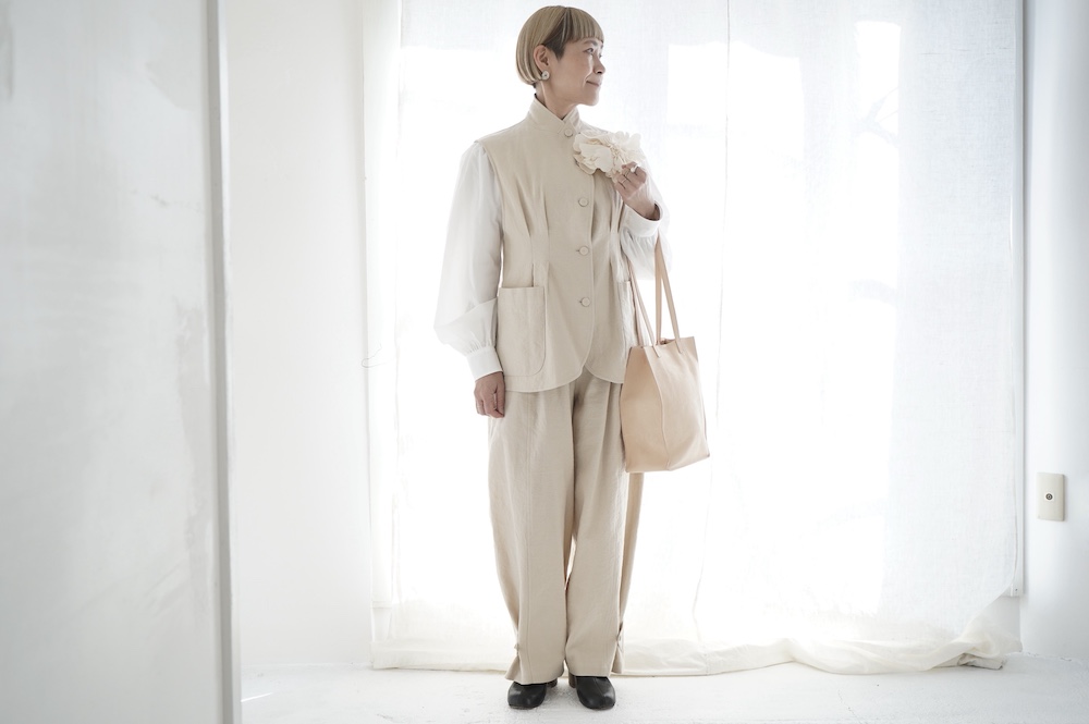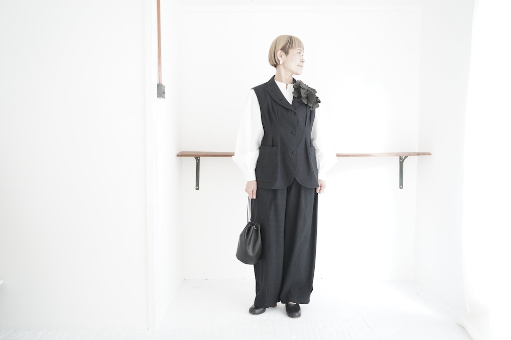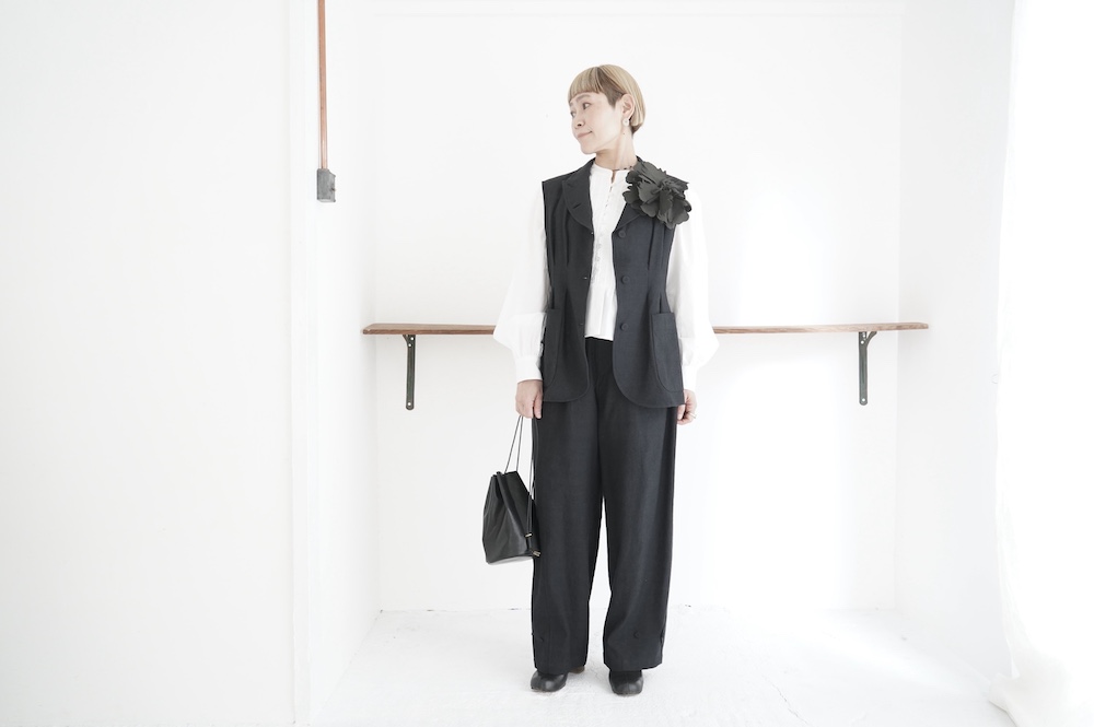 もう一つはこのベストです。展示会場では妻がチャコールのセットをノースリーブで試着して、それがカッコ良くて盛り上がりました。妻はよく「何でも似合う」と褒めていただくことが多いのですが、実はテーラードジャケットがとっても苦手です。ノーカラーは着るのですが、襟付きのテーラードJKはおそらく所持したことがないのではないでしょうか。僕は好きなので、展示会では試着などもお願いしたりするのですが、常に顔が引き攣っています。でも不思議ですよね。袖が取れただけなのに、、これはめっちゃ嬉しそうな顔で試着していました。