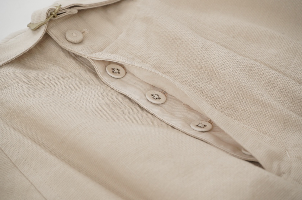背面にはパッチのヒップポケットが2つ。角丸の大きめなパッチポケットはあらためて聞いたことはないけどSUSURIさんの洋服に多いデザインですのできっとデザイナーの齋藤さんが好きなのでしょう。そういう細かいところにどんどん、年々らしさが蓄積されて、ネームを見なくてもSUSURIかな?なんてわかるようになる。