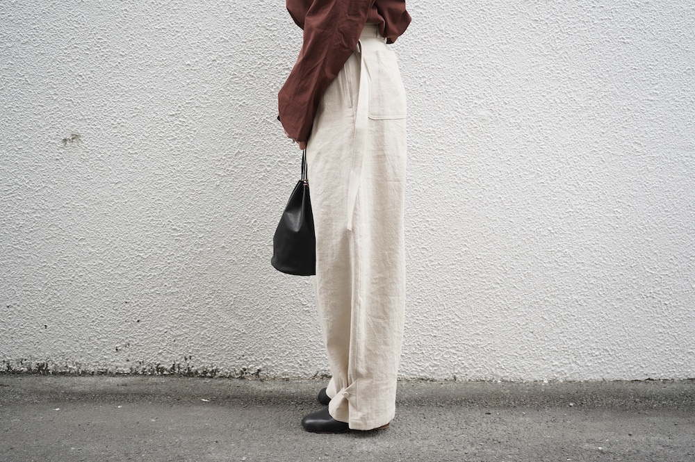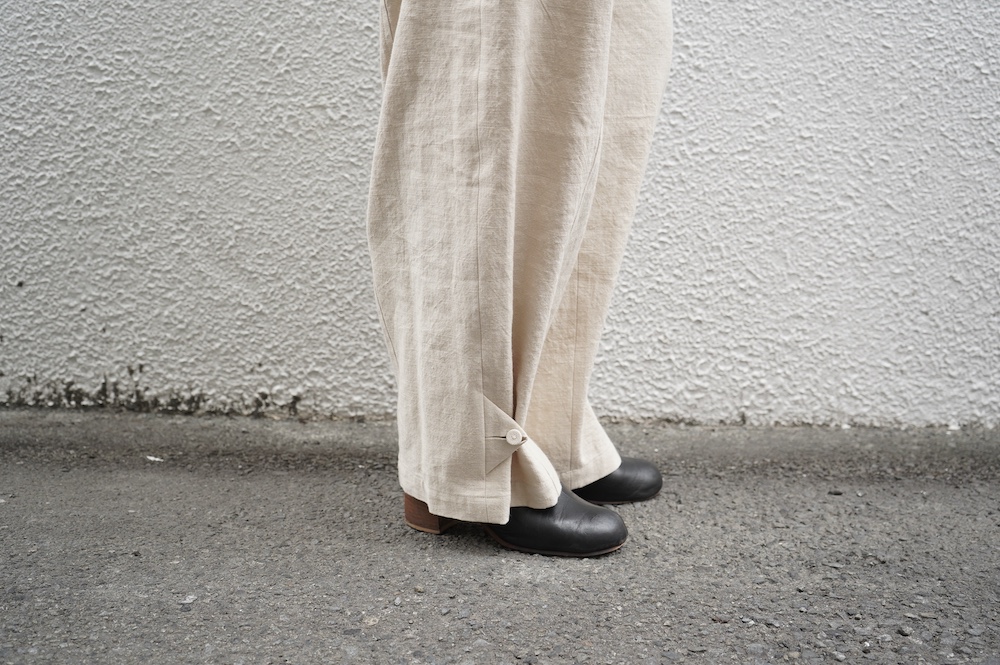 以前にもベルト付きのワイドパンツをいくつか作っているSUSURI。今回は裾タブとボタンで少し絞れるようになったワイドパンツです。フルレングスで、少し長めの設定でしたのでアナベルではサイズ0だけをセレクトしています。小さい方のサイズですが、身長155cmの妻で6cmのヒールを履いてちょうどいいくらいのレングスです。