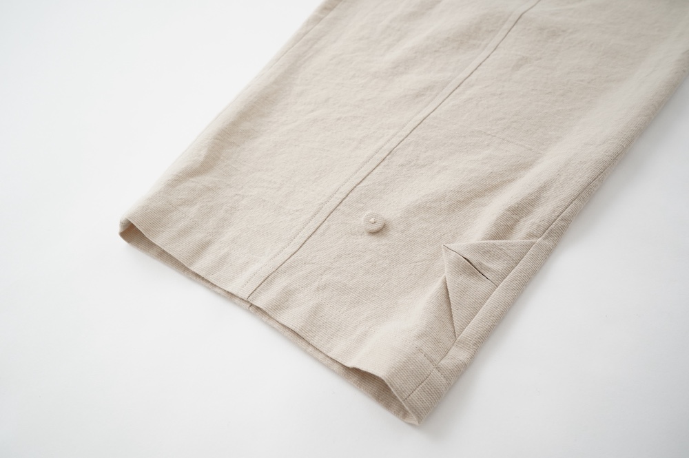 背面にはパッチのヒップポケットが2つ。角丸の大きめなパッチポケットはあらためて聞いたことはないけどSUSURIさんの洋服に多いデザインですのできっとデザイナーの齋藤さんが好きなのでしょう。そういう細かいところにどんどん、年々らしさが蓄積されて、ネームを見なくてもSUSURIかな?なんてわかるようになる。