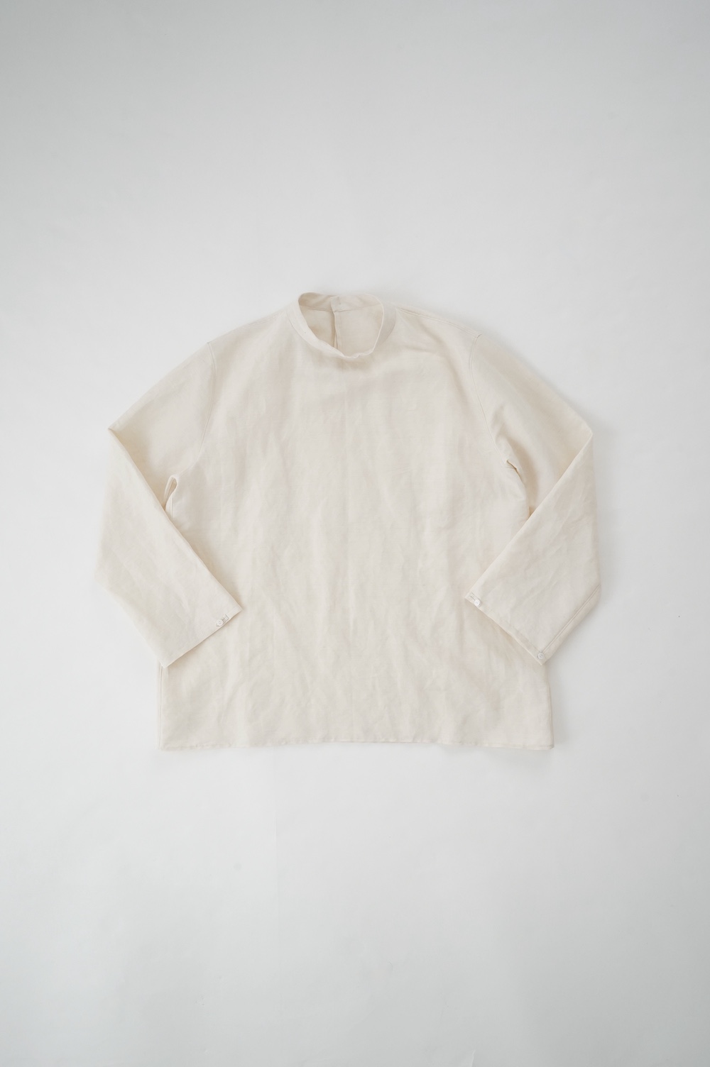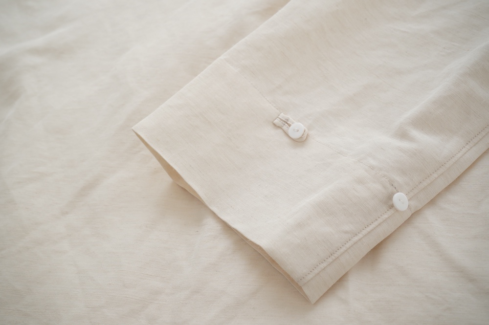 コットンと同じく首に沿うように立ち上がったバンドカラー。