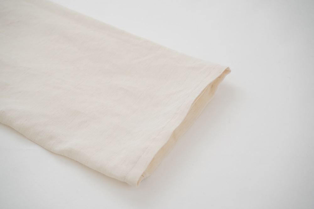 着用した写真を見ると、白っぽく見えていますが実際にはよこ糸の際立ったシャンブレーのキナリです。タッチは触ったらそれとわかるシルク特有の張り感が少しあり、上品な光沢感が特徴です。染色も脱色もしていない自然な状態のシルクです。