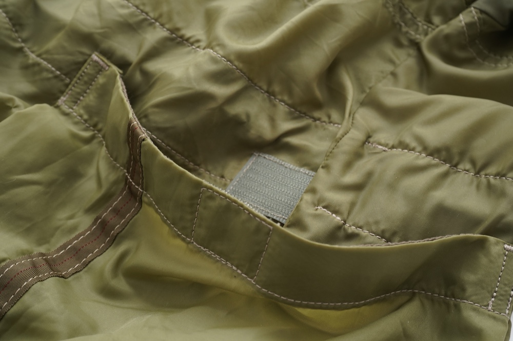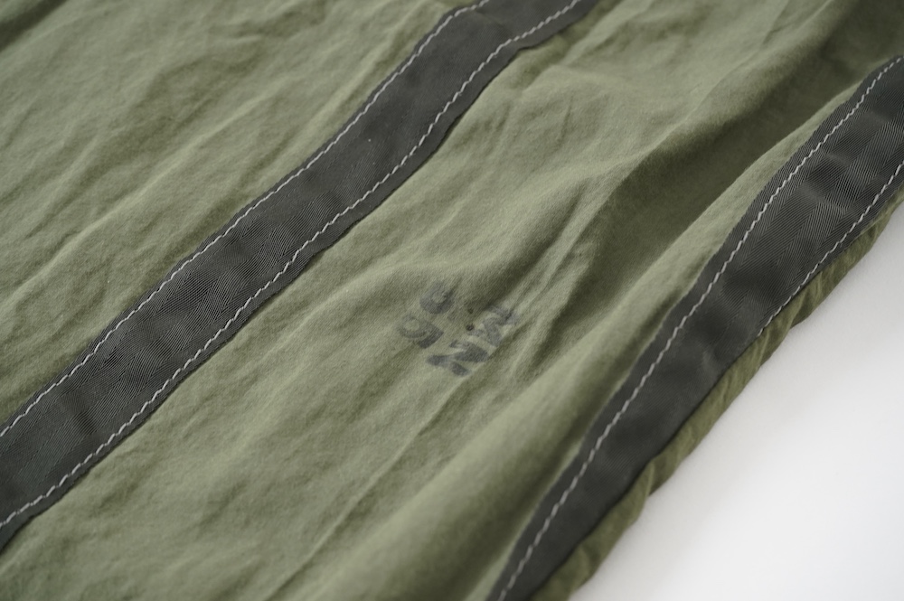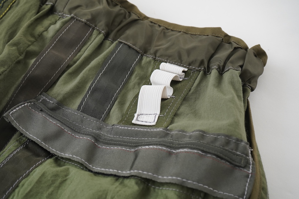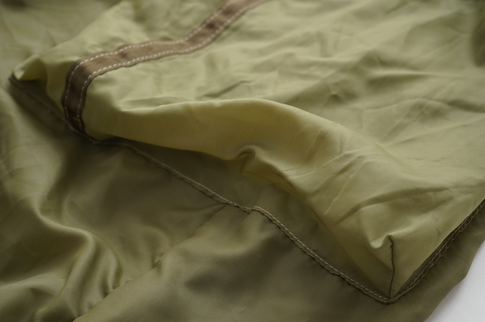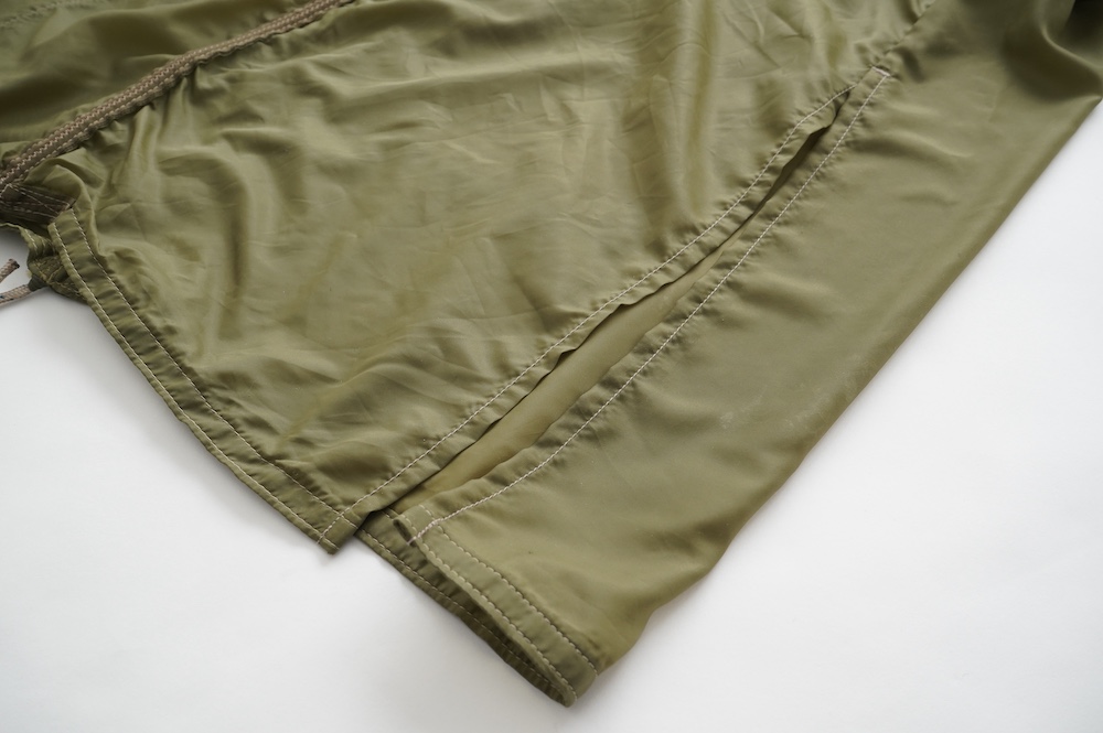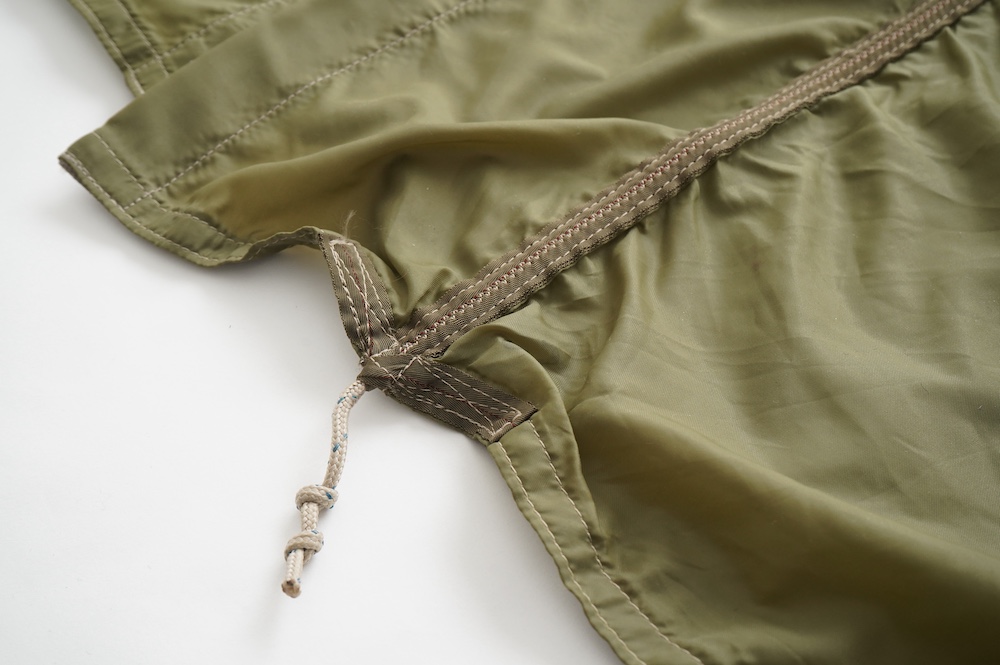 裾に見られるこちらは、パラシュートクロスに使われていたものらしいのですが、現状使えません。使えないけどとっても雰囲気があるので残したパーツです。縫い留めてあるので紐を引っ張っても動きません。