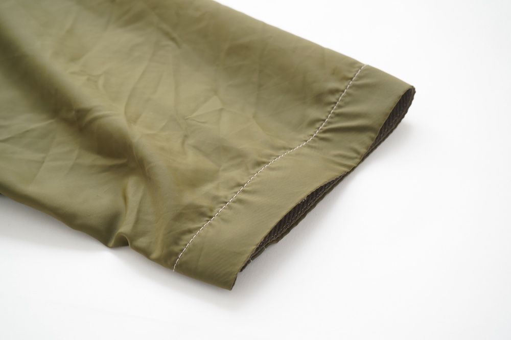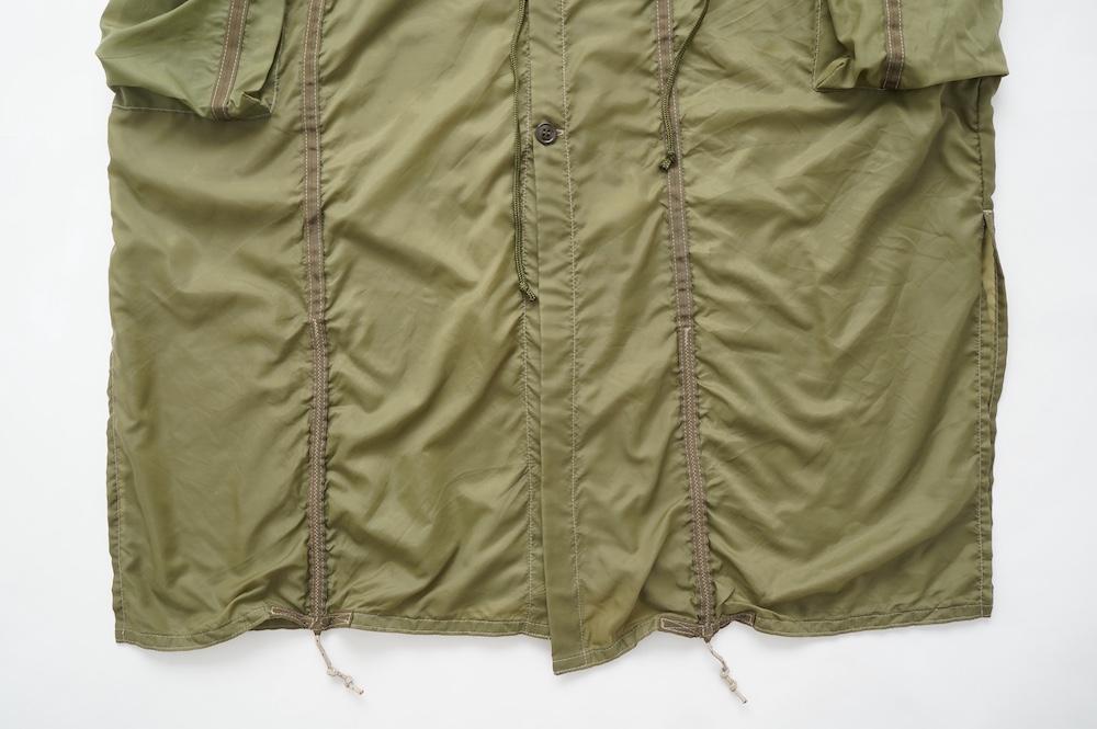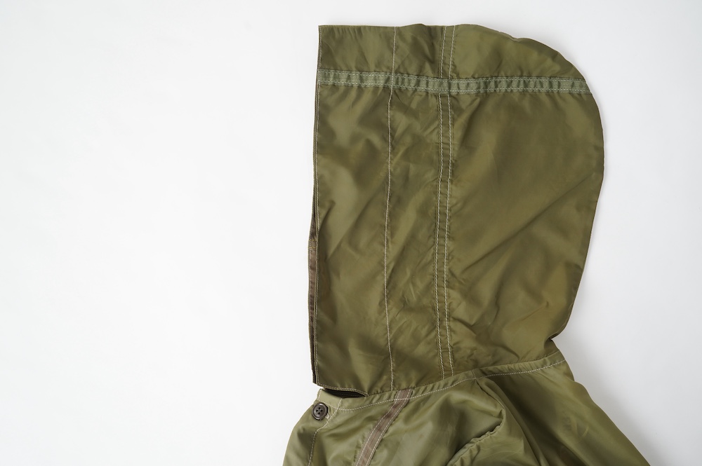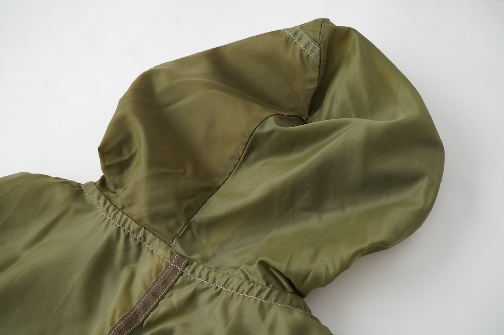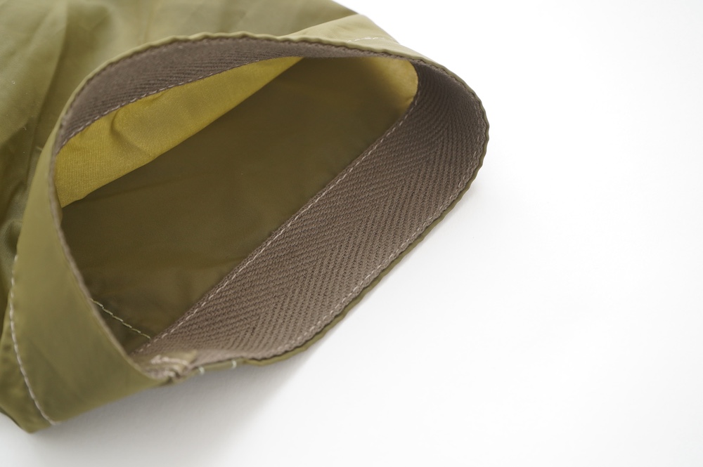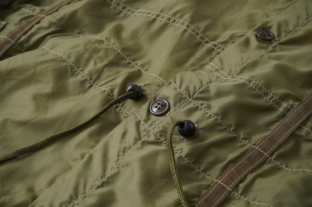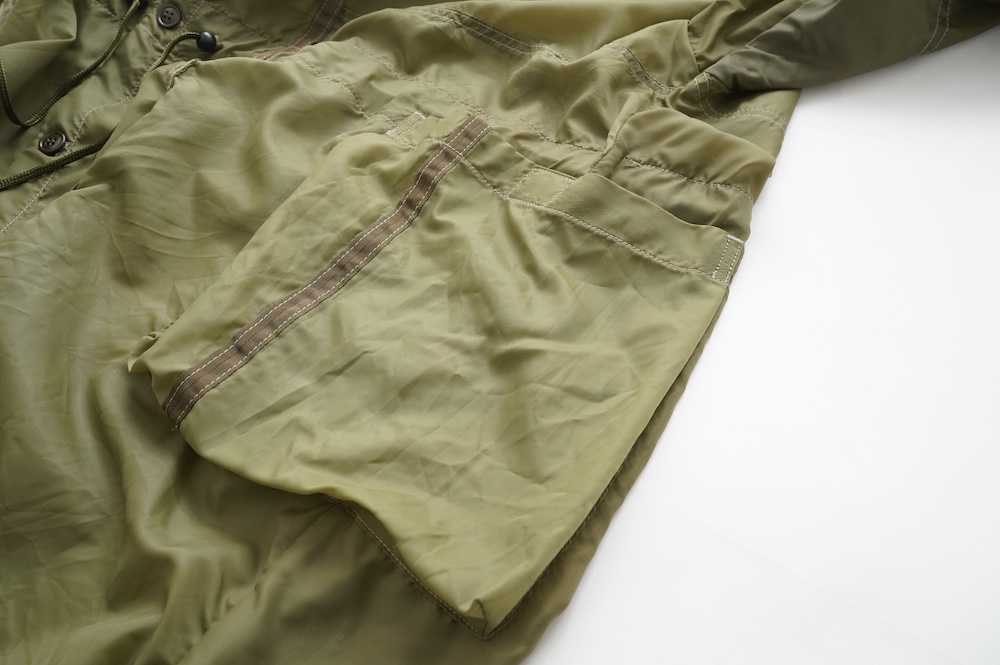 裾に見られるこちらは、パラシュートクロスに使われていたものらしいのですが、現状使えません。使えないけどとっても雰囲気があるので残したパーツです。縫い留めてあるので紐を引っ張っても動きません。