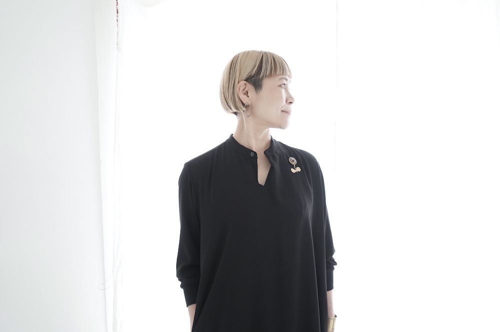 シンプルに一枚で着用しています。卒業式や入学式などを意識したスタイリングで、普段は使わないラメ入りのストッキングにR.U.の新作シューズを合わせています。ブローチは例年楽しみにしている西別府さんの植物と真鍮のブローチです。