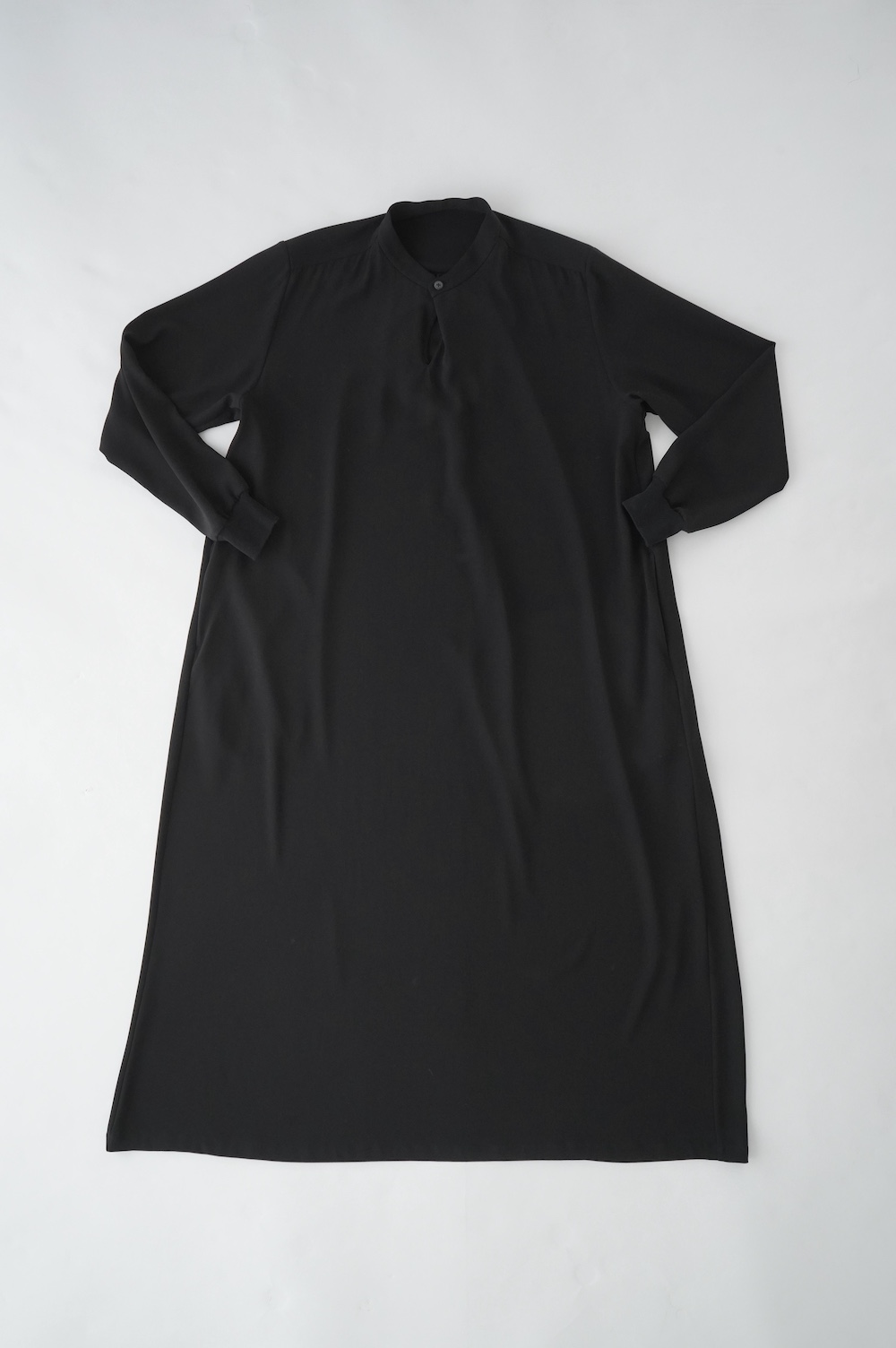 トリアセテート/ポリエステルの薄手のフォーマル対応素材を用いたワンピースは、一重でとろみのがあり美しいドレープ感が特徴のブラックワンピースです。着用毎には必要ありませんが、シーズンに一回程度のクリーニングでケアしてください。