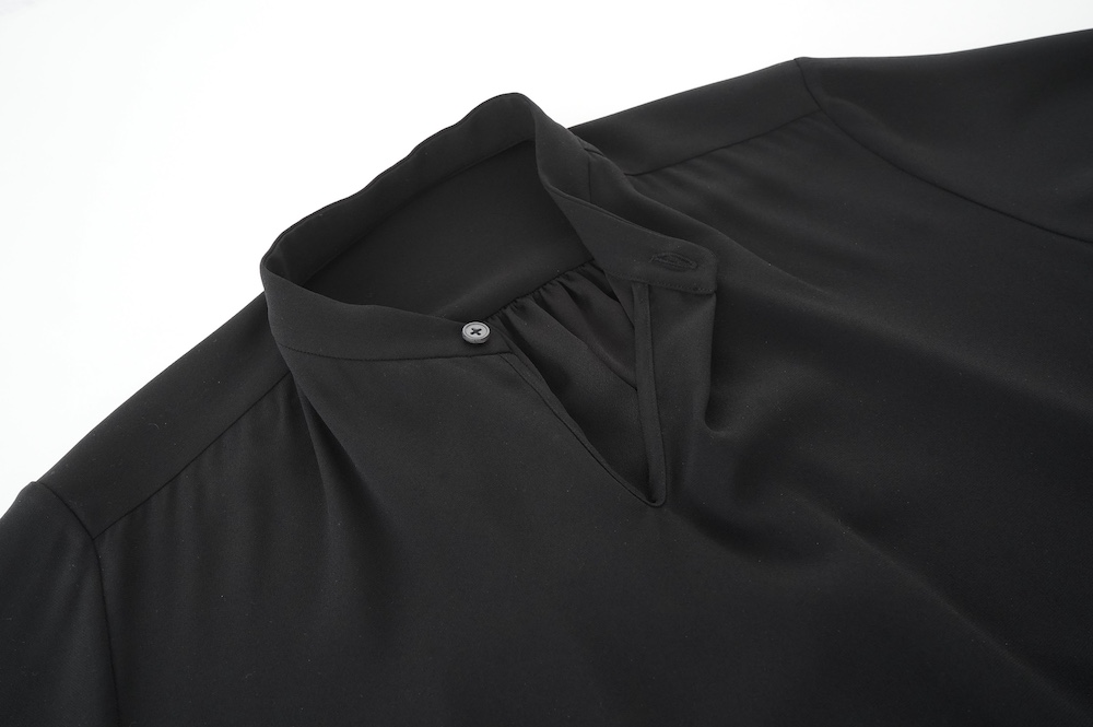 ネックはバンドカラーでボタンが一つです。ボタンの下の隙間が女性らしいポイントです。