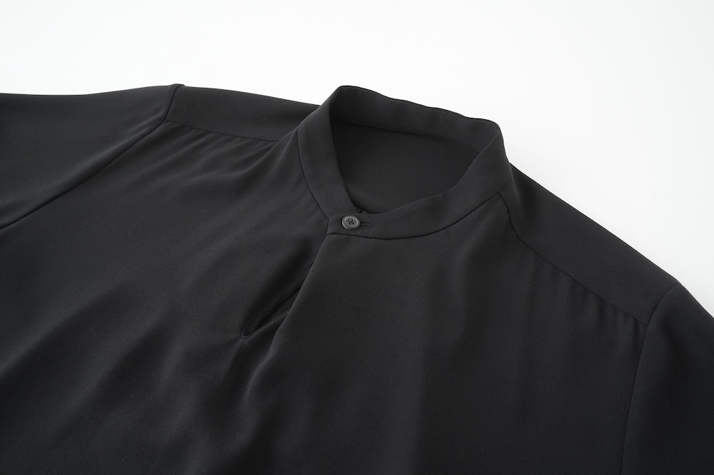 ネックはバンドカラーでボタンが一つです。ボタンの下の隙間が女性らしいポイントです。