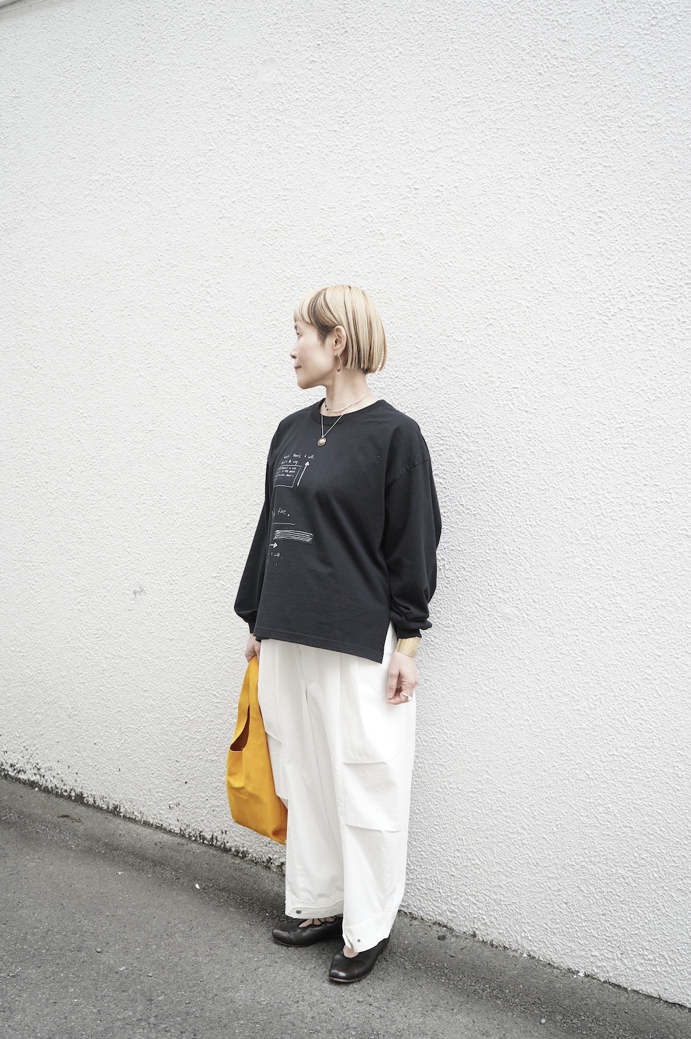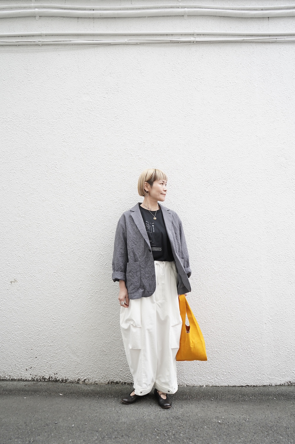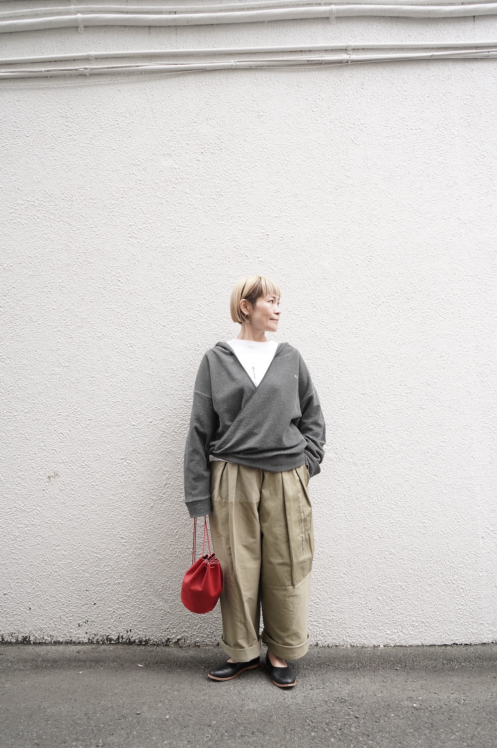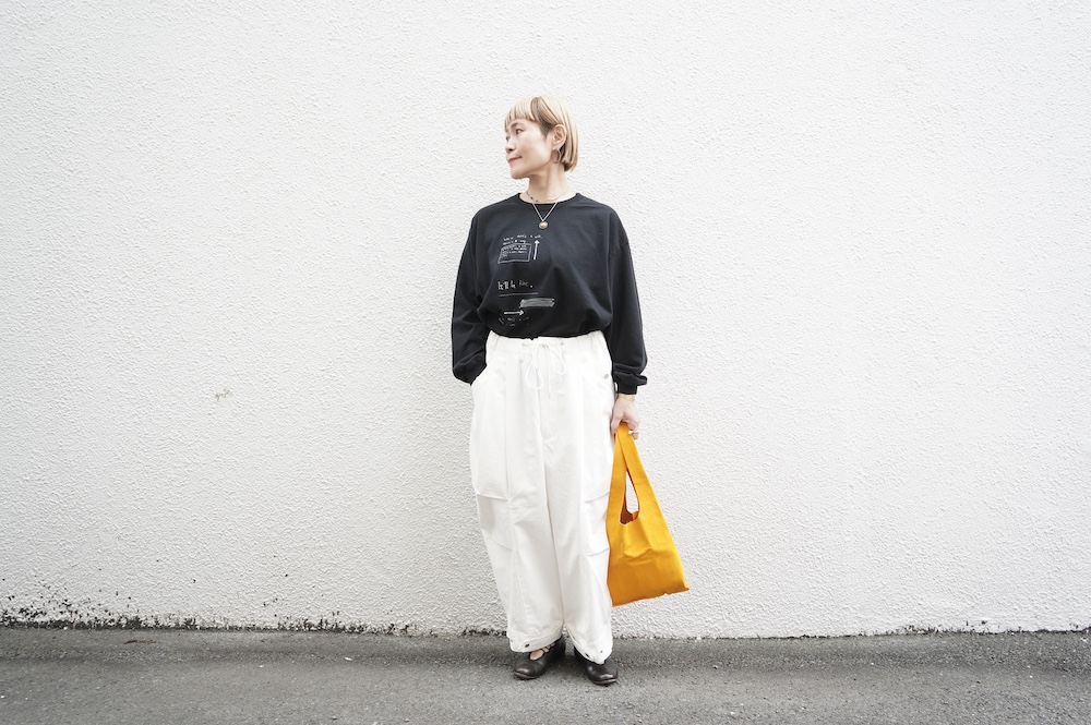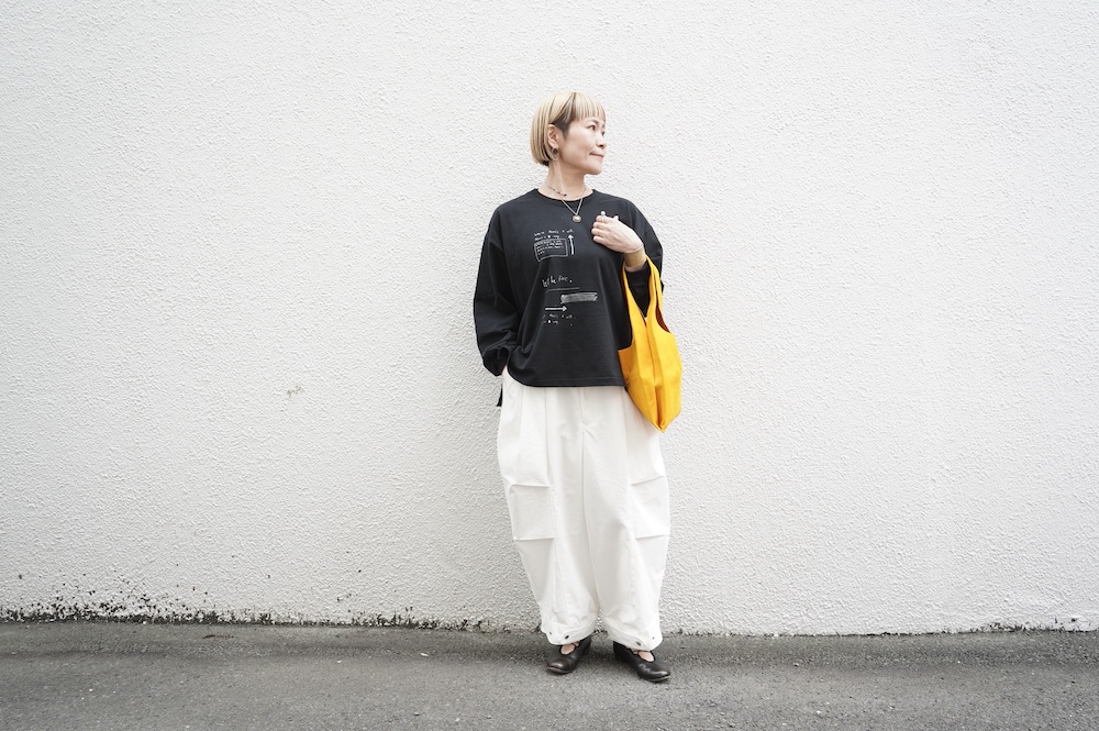 こちらはArtepoveraのリメイクパンツに合わせてワンツーコーデ。大きめサイズのパンツをロールアップしてみました。