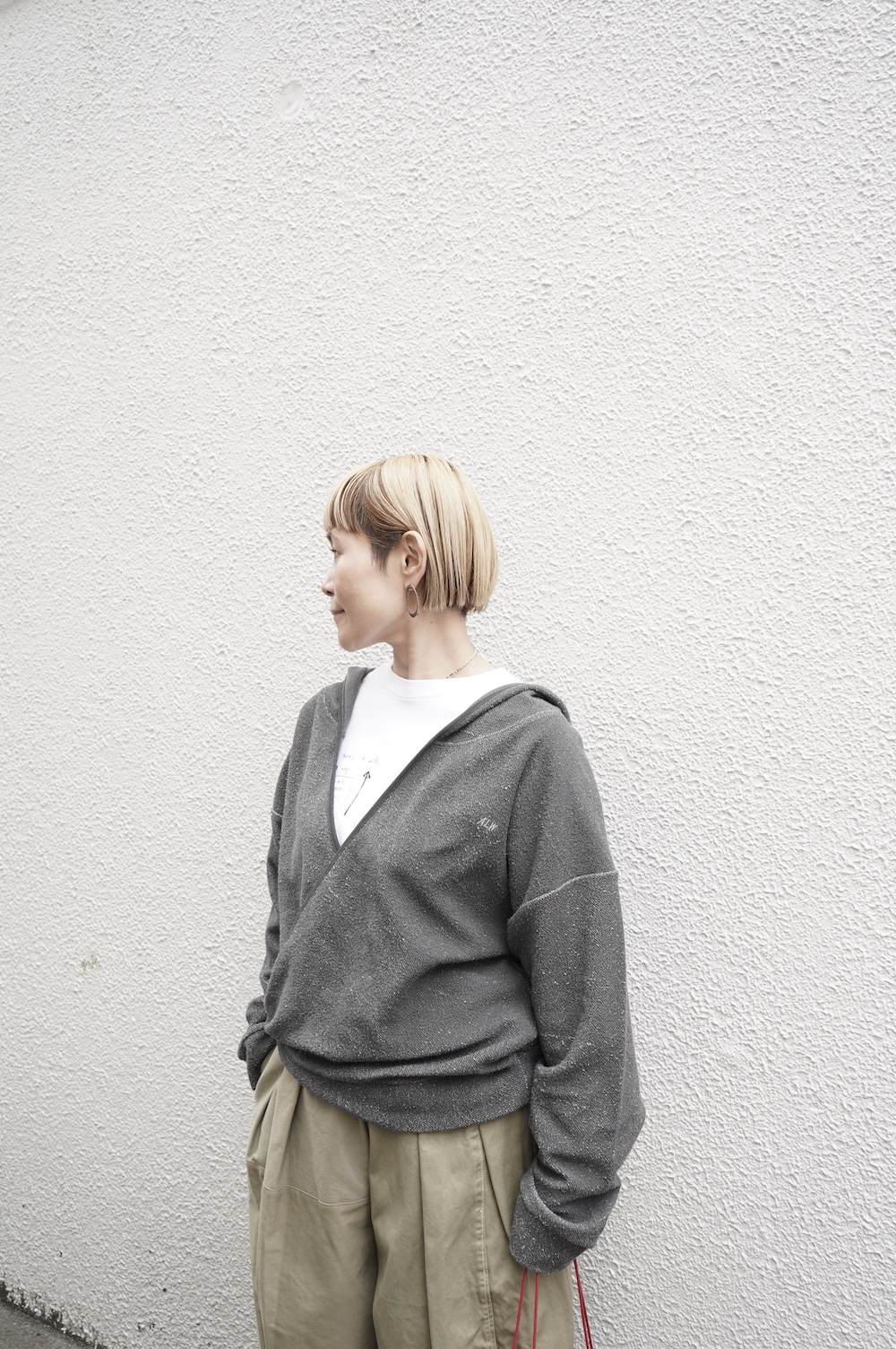 こちらはちょっと面白いALWELのカシュクールパーカーに合わせてインナー使い。プリントがカッコいいので、ジャケットやパーカーのインナーとしてもお勧めですよ。むしろ大人はそういったインナー使いメインで考えると使いやすいかも。