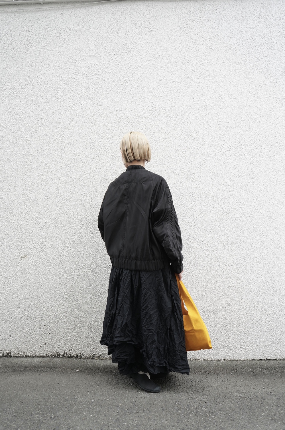 今回は同じくDDUDのレイヤースカートに合わせてスタイリング。もうだいぶ先に入荷していたこのスカートは、実は受注会で2番人気でした。このスカートの背面にかけてのカッティングも面白いし、実際かなり目を見張るものがあります。
