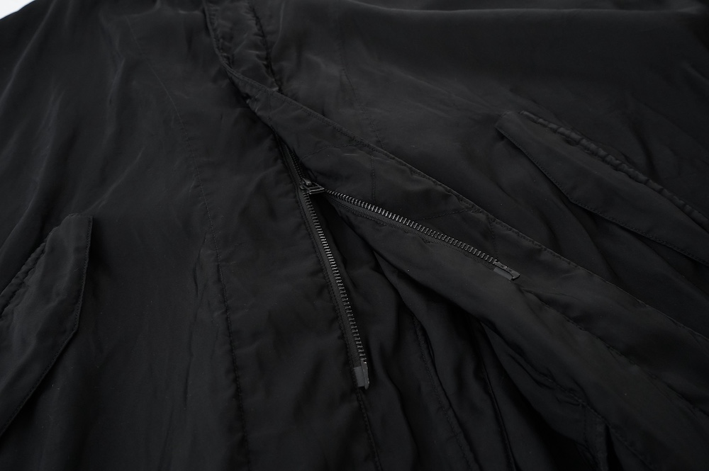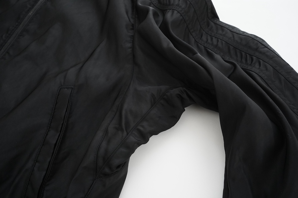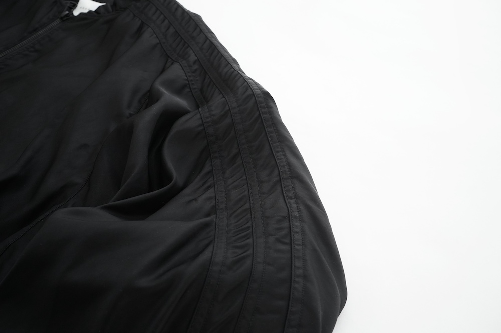 生地は3本ラインブルゾンと同じくマットな光沢感が素敵な超高級ナイロン。非常に手触りの良い素材です。ぺたっと平置きすると分かりやすいのですが、極端に前身を絞っています。すっごいダボっとした服なんだろうな、、と思って着てみると、前から見た感じは意外にかっこいい感じなんです。分量は後ろで出している。