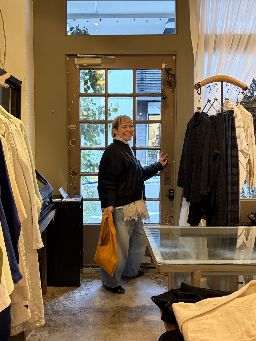 この日、奈々さんはお気に入りのHAVERSACKの19世紀セルビッチデニムに合わせて着用していました。他にもサスペンダーパンツやオールブラックで着ているのかな?忘れちゃうからまた写真で残しておこうと思います。