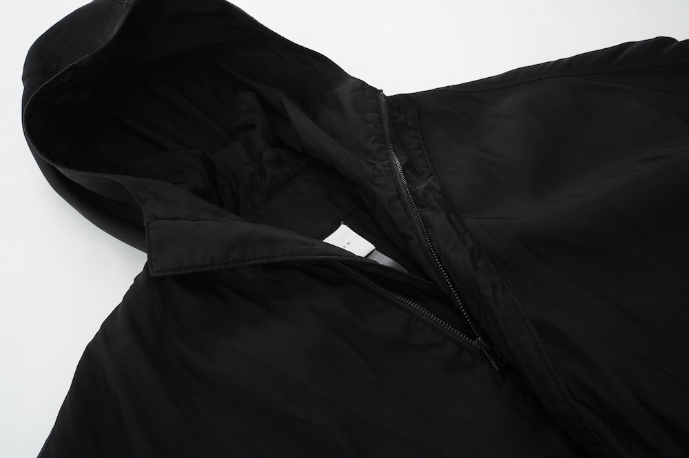 生地は3本ラインブルゾンと同じくマットな光沢感が素敵な超高級ナイロン。非常に手触りの良い素材です。ぺたっと平置きすると分かりやすいのですが、極端に前身を絞っています。すっごいダボっとした服なんだろうな、、と思って着てみると、前から見た感じは意外にかっこいい感じなんです。分量は後ろで出している。