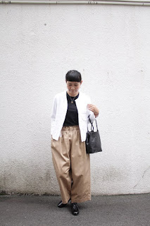 ベージュのワイドパンツに、ブラックの