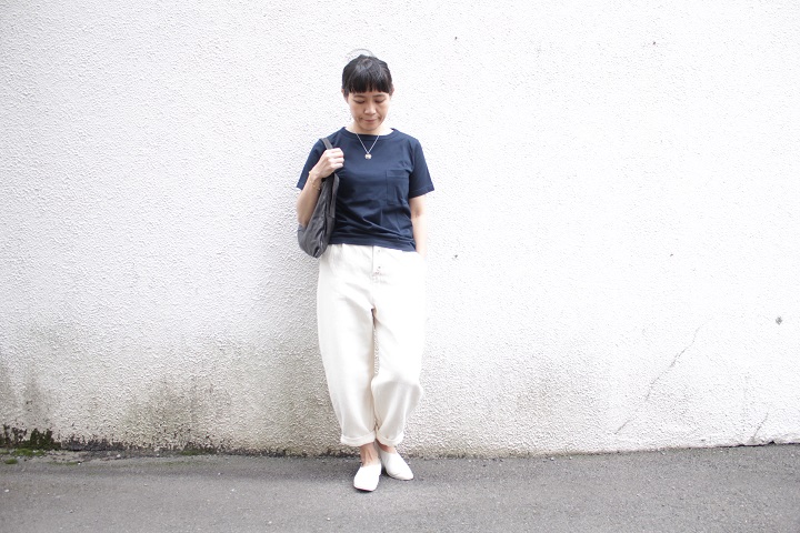 シンプルなTシャツにロールアップせず、そのまま。