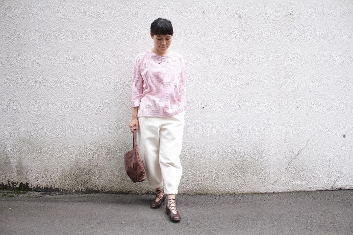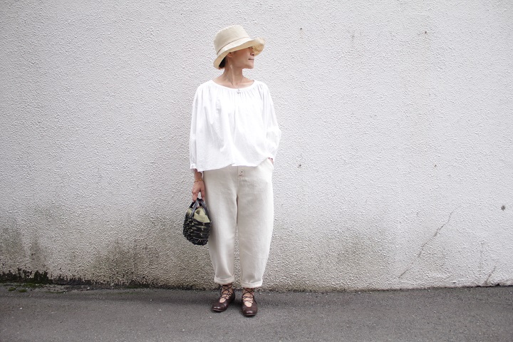 ゆったりギャザーブラウスをロールアップ。