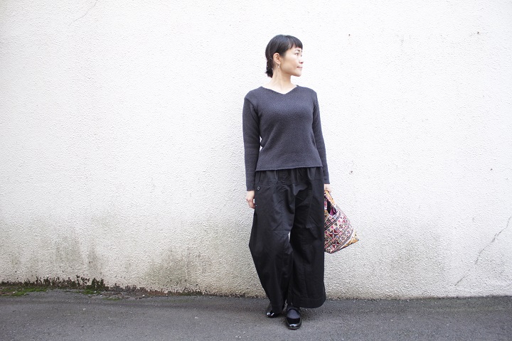 evam eva の春のコットンニットと合わせて、ブラック。