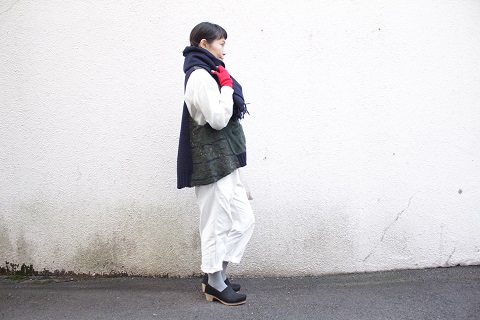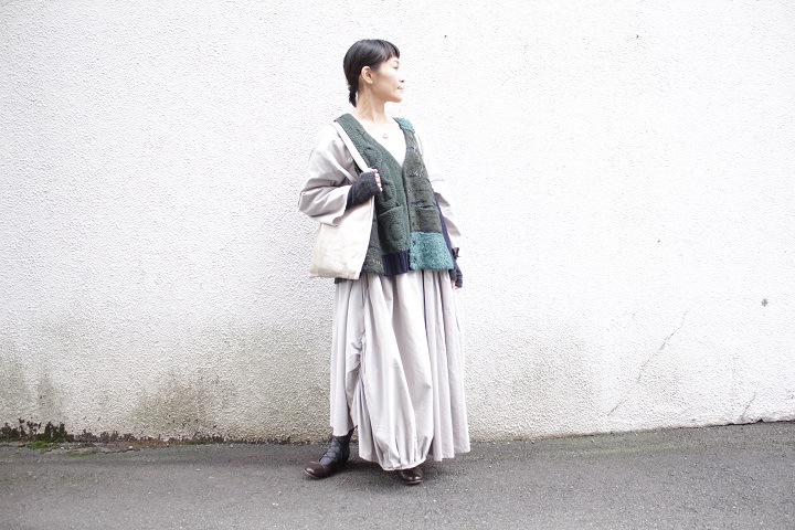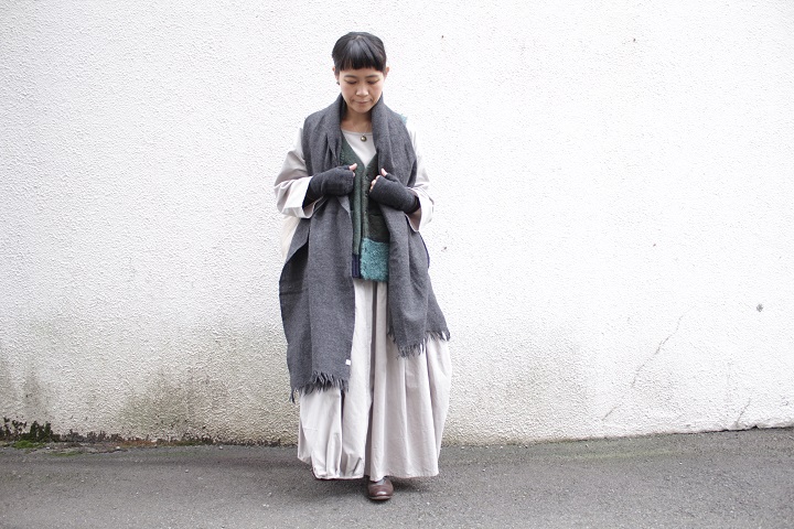 SOIL の大判ストールを首元に巻いて完成です。
