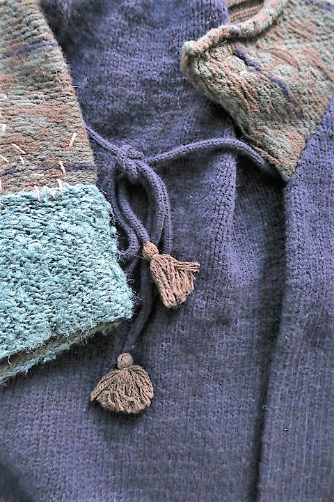 タッセル付きのひもが4本付いた、カシュクール仕立て。
