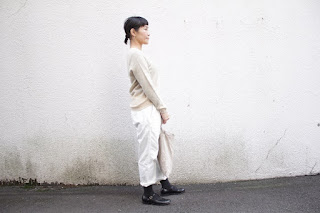 丸首のキナリは、ホワイトチノに合わせて爽やかに。