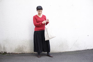 FIRMUM のワイドパンツに、今度はネイビーの丸首を。