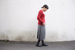 Vネックとは対照的に、トラッドなプリーツスカートで