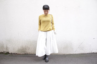 ボトムスの変化だけで、同じ色でも印象はガラリと変わります。
