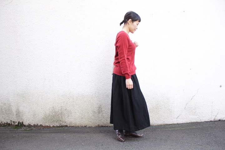 Vネックとは対照的に、トラッドなプリーツスカートで