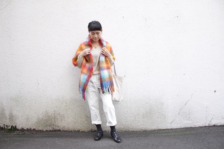 トラッドな印象のスタイリングには、こんなストールが