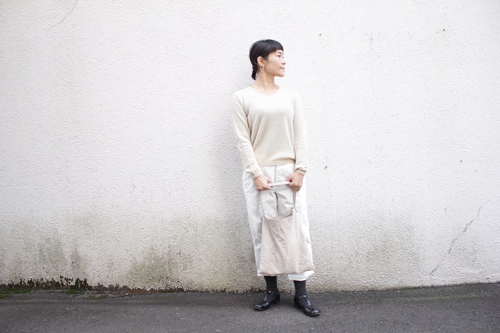 丸首のキナリは、ホワイトチノに合わせて爽やかに。