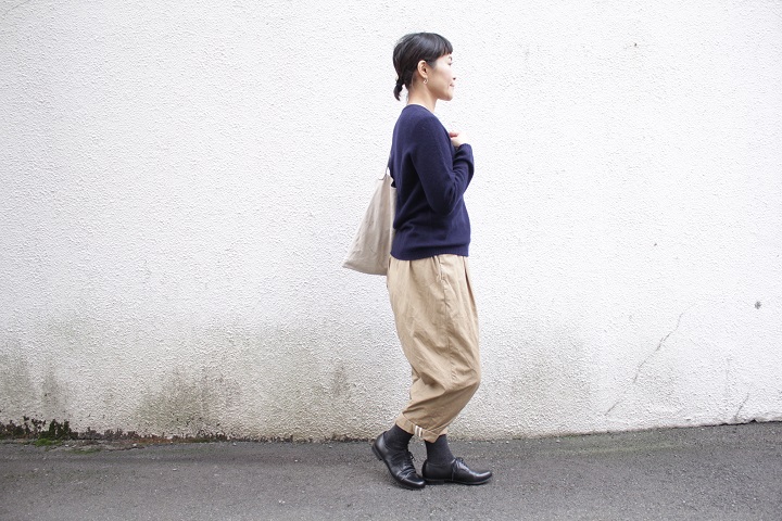 FIRMUM のワイドパンツに、今度はネイビーの丸首を。