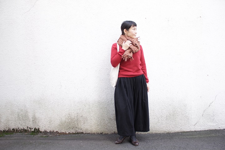 ボトムスの変化だけで、同じ色でも印象はガラリと変わります。