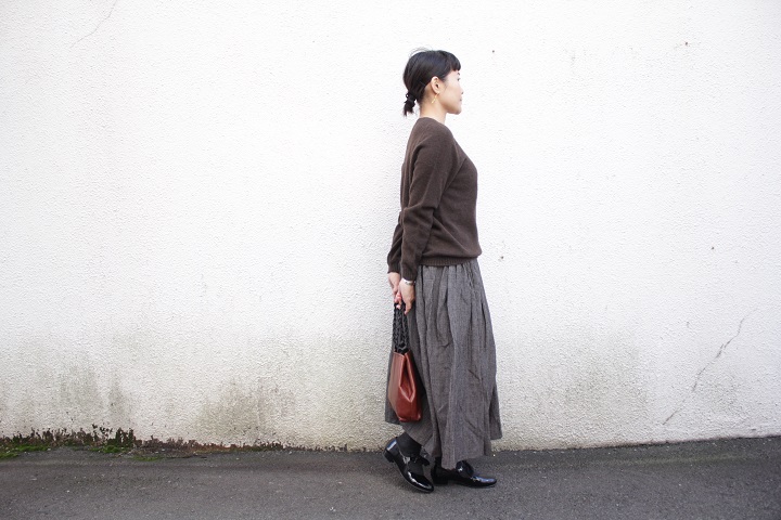 SOIL の格子柄のスカートにクルーネックのブラウン。