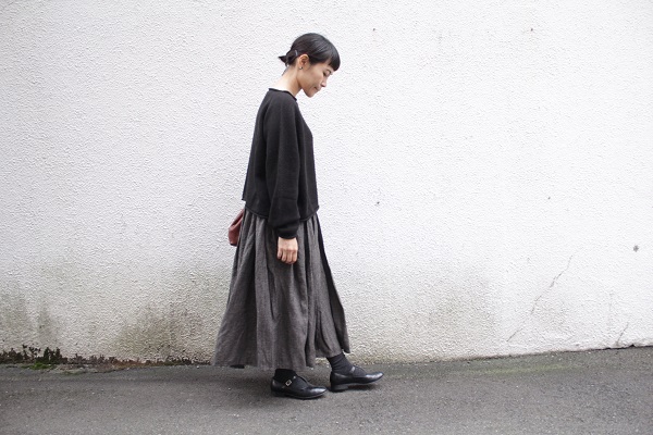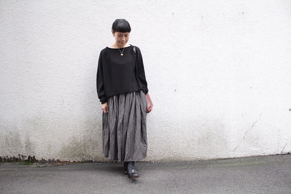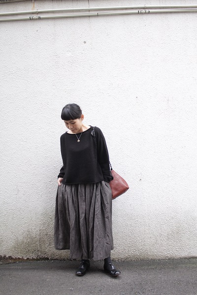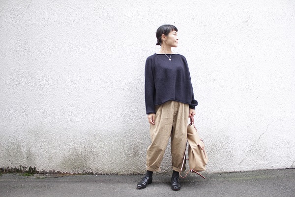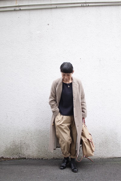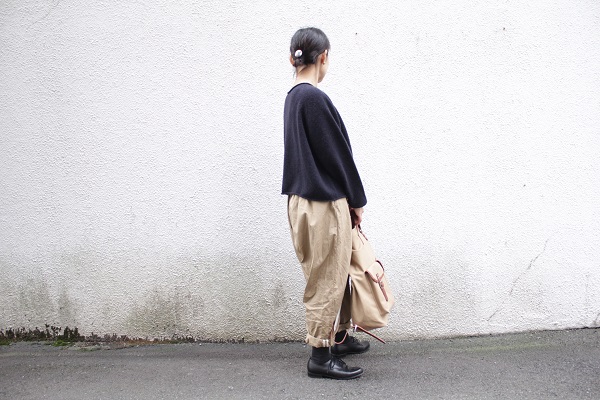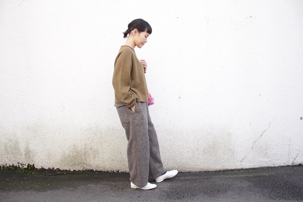 こちらは、ゴーシュのWOOLワイドパンツにオリーブ。