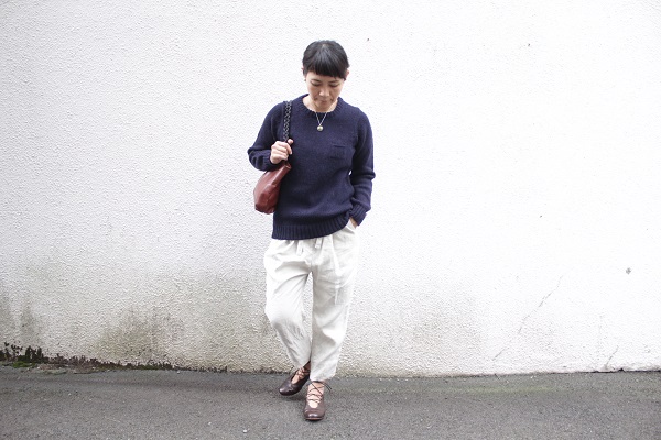ゴーシュのリネン素材のひもパンツにネイビー。