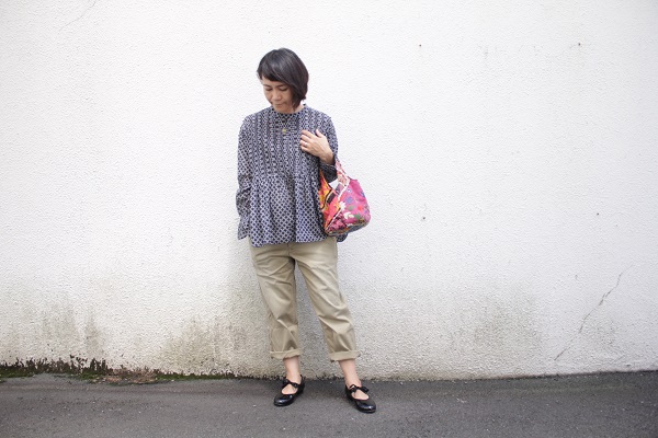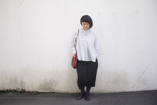 白のブラウスは、FACTORY のサルエルパンツに合わせて。