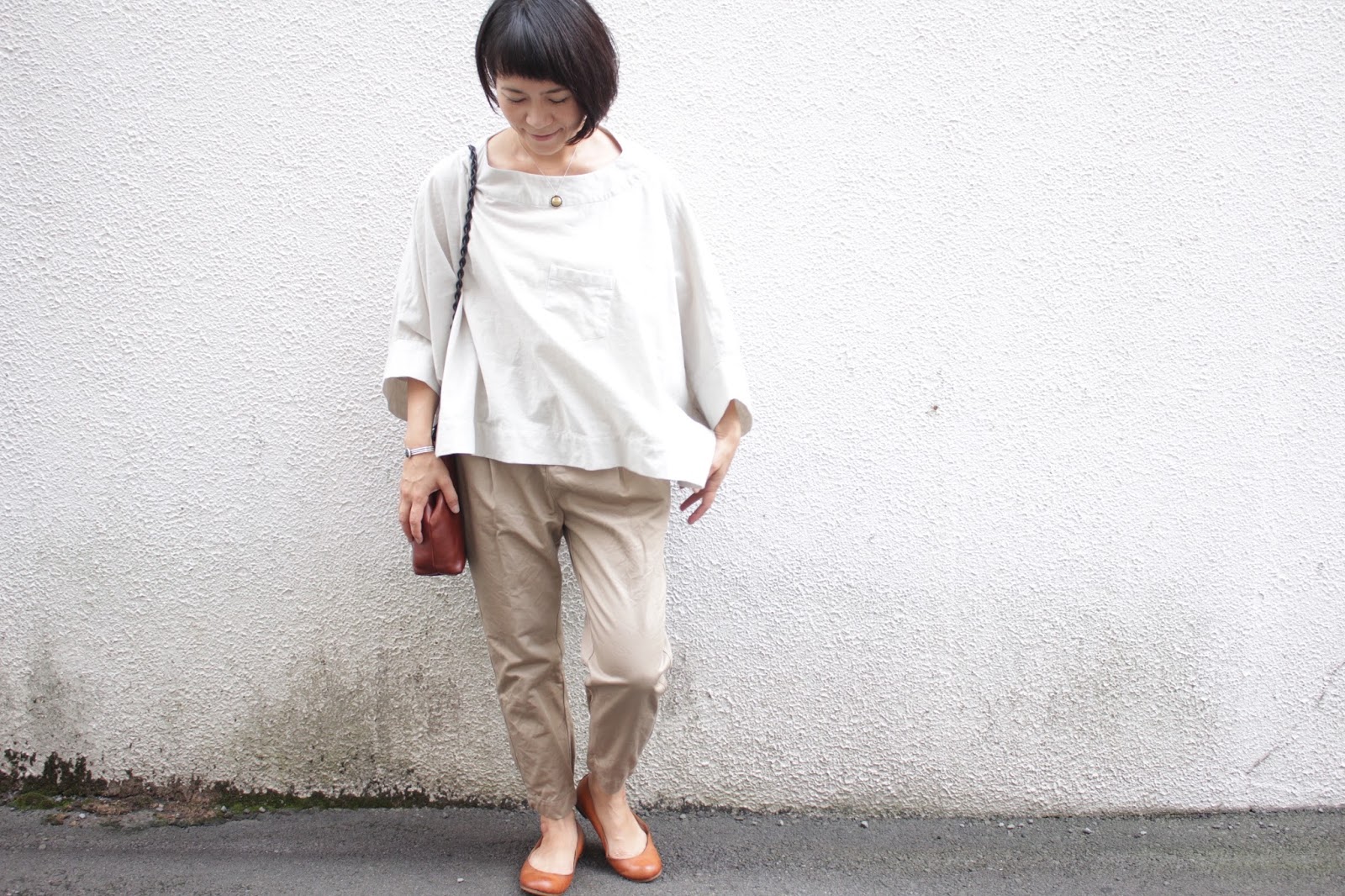 ゴーシュの裾ゴムテーパーパンツにベージュ。