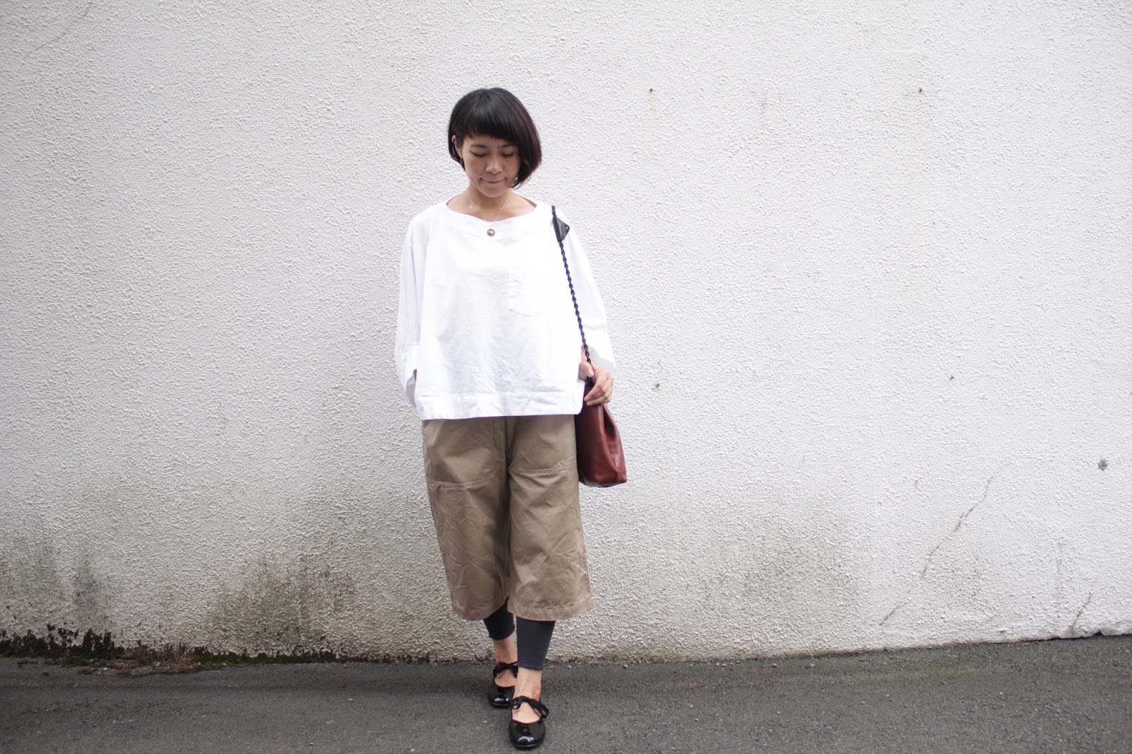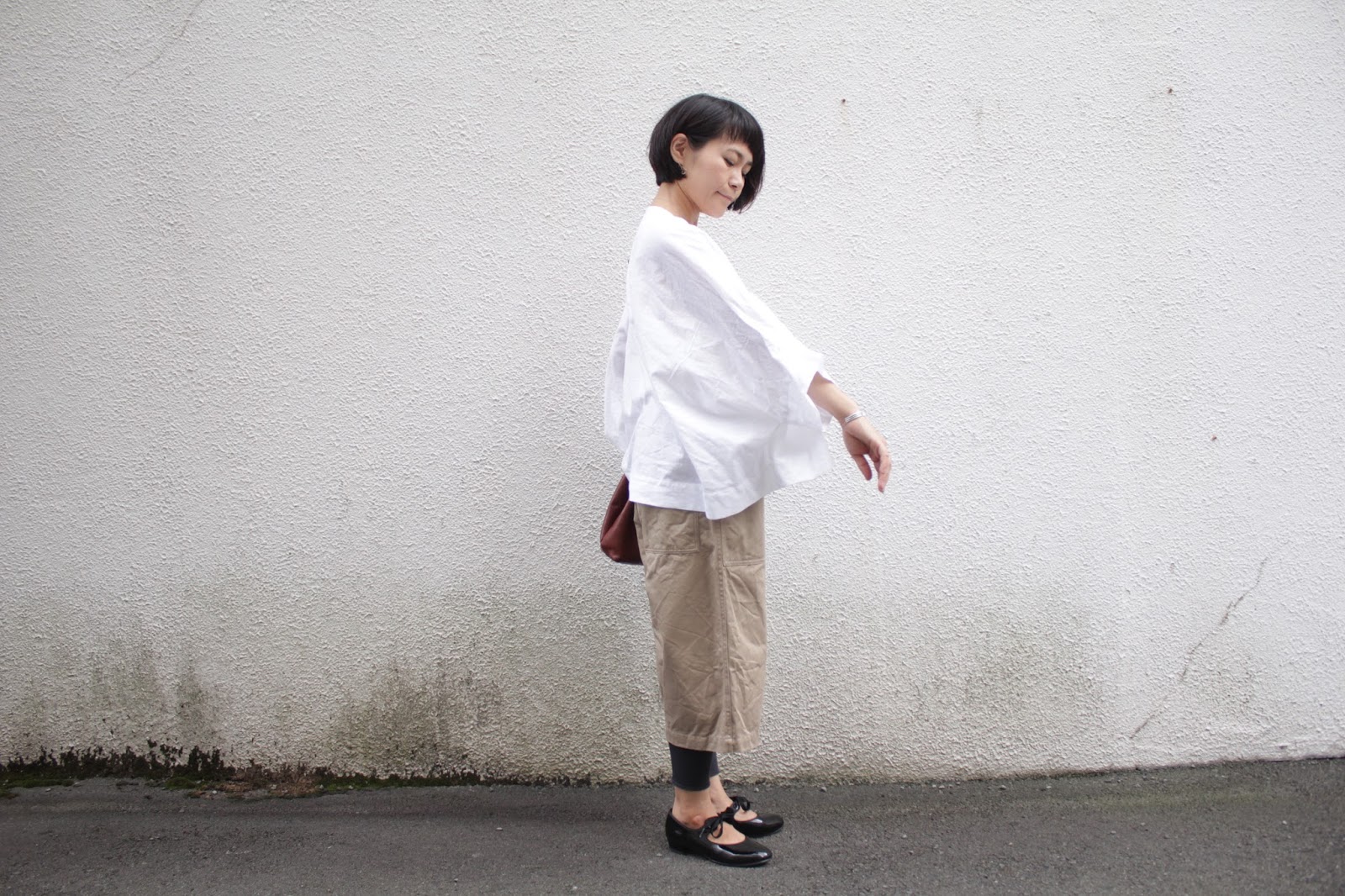 ベージュ系にはもちろん、白のボトムスと合わせても