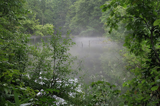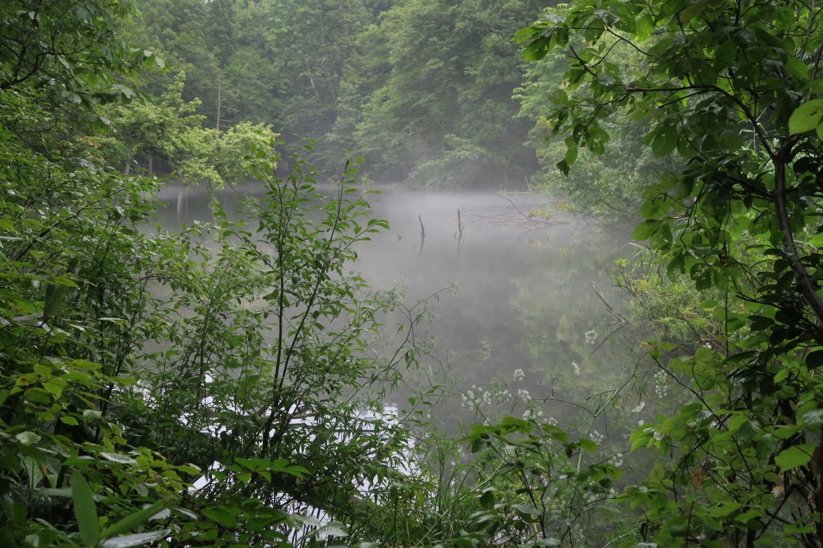 静かな湖畔の森の陰から。