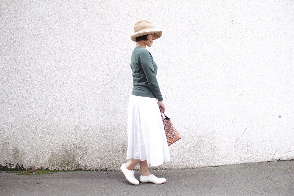 白いスカートにトラッドな雰囲気でソフトグリーン。